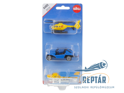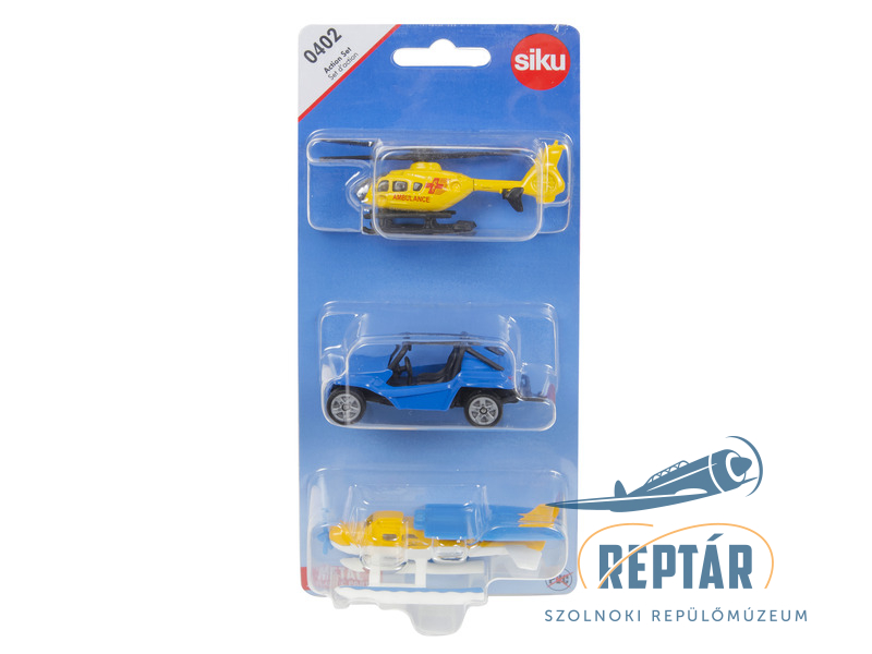 Akciókészlet, amely a következőkből áll: Eurocopter EC 135 mentőhelikopter (1996-2013-as modell) (vö.: 0856) + veszélyes buggy / HAZ buggy (VW Beetle 1200 rövidített alváza, GRP karosszériával, 9 Billfner: Autohanusich K Rudolfhor 9 2000 Hamburg 28 (1968-1983) vagy Buggy-Center-Hamburg Gisela Kühn Stadtbahnstraße 94 2000 Hamburg 65 (1983-1990) vagy névváltoztatás GmbH-ra ugyanazon a címen (1990-1992), motor: VW boxer four-cylinder -löketű Otto 1192 cm3-vel és 34 LE-vel, tengelytáv 2027 mm, hossz 3210 mm, modell 1968-1992, gyártási év 1972) (vö. 1057, 3. változat) + hidroplán (vö. Cessna Skyhawk, single type four-172a -motoros könnyű repülőgép, süllyesztett törzs hátsó, hátsó ablakkal. 3 éves kortól ajánlott